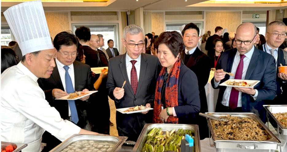 中国烹饪协会会长杨柳向张建春副部长、曲星副总干事、马蒂厄·盖维尔局长等中外嘉宾介绍了菜品的设计初衷与内在理念,诚挚邀请他们品尝中华美食佳肴。