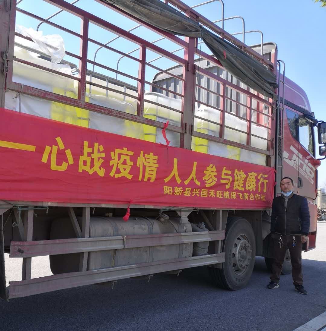 阳新县在打响疫情防控阻击战后,消毒液等抗疫物品就成了紧缺物资,阳新县农业农村局向全县植保、农资等部门发布需求信息,兴国禾旺植保飞防合作社负责人袁剑得知后提供了一条信息:中化作物保护品有限公司有意向捐赠 16 吨次氯酸钠 ( 10%) 消毒液,不过,需要去江苏提货。得知信息后,阳新县农业农村局立即委托袁剑前往江苏办理提货事宜。